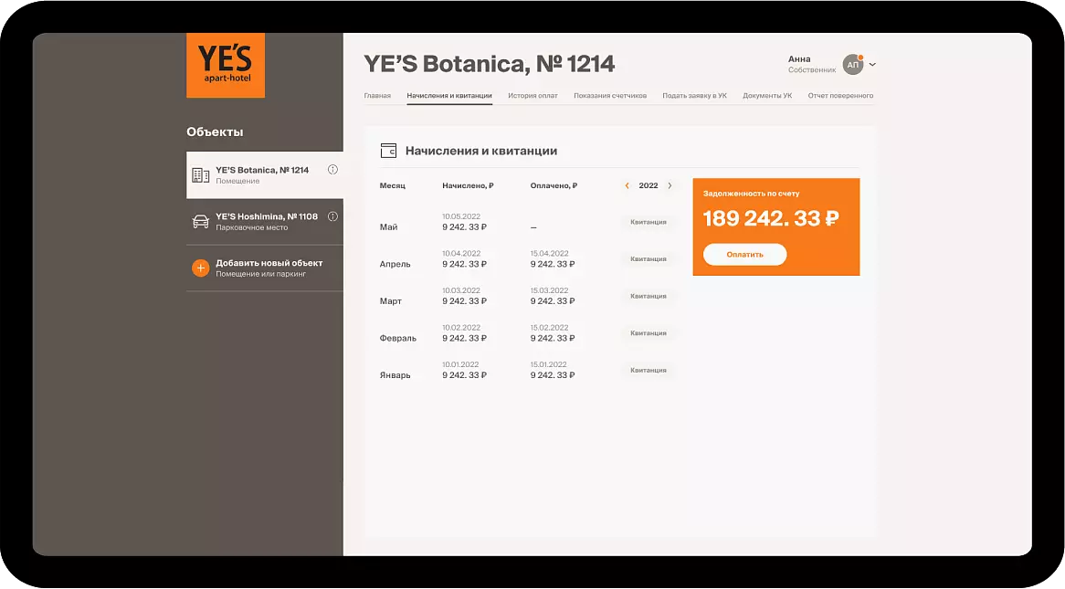 Благодаря индивидуальному дизайну и интеграции с модулем 1С ЖКХ, личный кабинет стал незаменимым помощником для владельцев апартаментов сети YE’S.